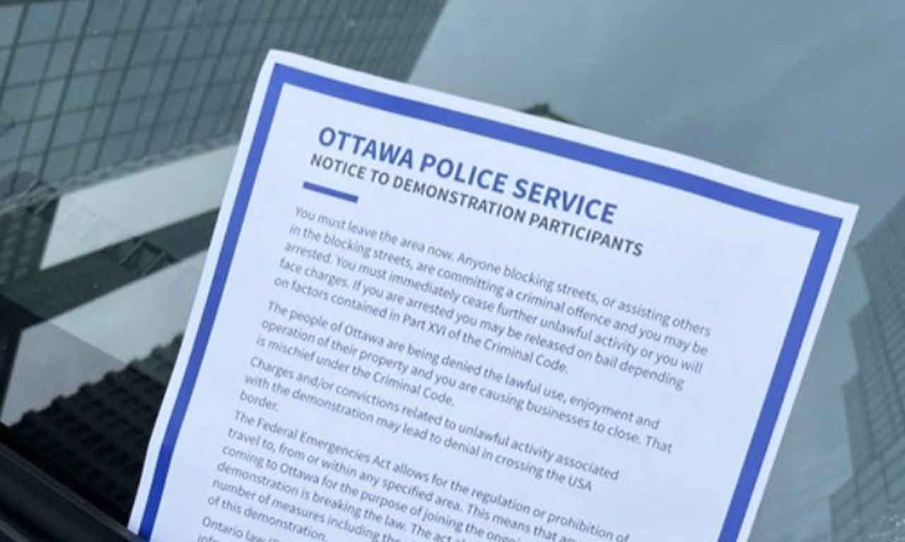 OTTAWA – NEWS – Ottawa Police are in process of handing out notices in the downtown to protestors.