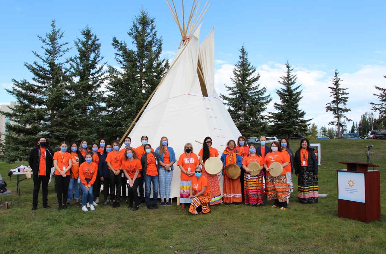 A pair of powerful symbols of the Hospital’s commitment have been unveiled today. The first, a newly raised, 20-foot tall tipi served as the backdrop as the National Day for Truth and Reconciliation began with singing and drumming by local women. Elder Myria Esquega (member of Fort William First Nation) led the ceremonial opening of the tipi with prayer and smudging with the sacred medicines, tobacco, sage, cedar and sweetgrass. “Having a tipi onsite at Thunder Bay Regional Health Sciences Centre is a culturally significant moment for our organization,” said Crystal Pirie, Senior Director, Indigenous Collaboration. “It symbolizes our Hospital’s commitment to supporting and enhancing Indigenous peoples’ healing journey while in our care.”