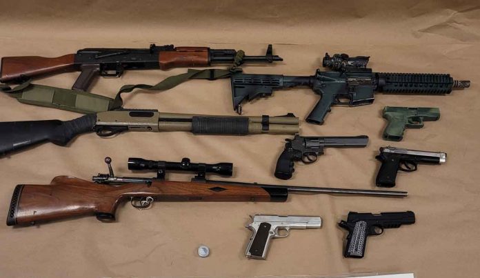 Officers seized weapons and drugs including suspected Methamphetamine, center-fire bolt-action rifle, Airsoft replica pump shotgun, five Airsoft replica handguns, and two Airsoft replica military rifles.