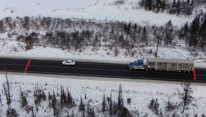 Utilizing a drone to get a real time bird’s-eye view, officers could spot motorists in commercial vehicles following too closely via the 60-metre markers.