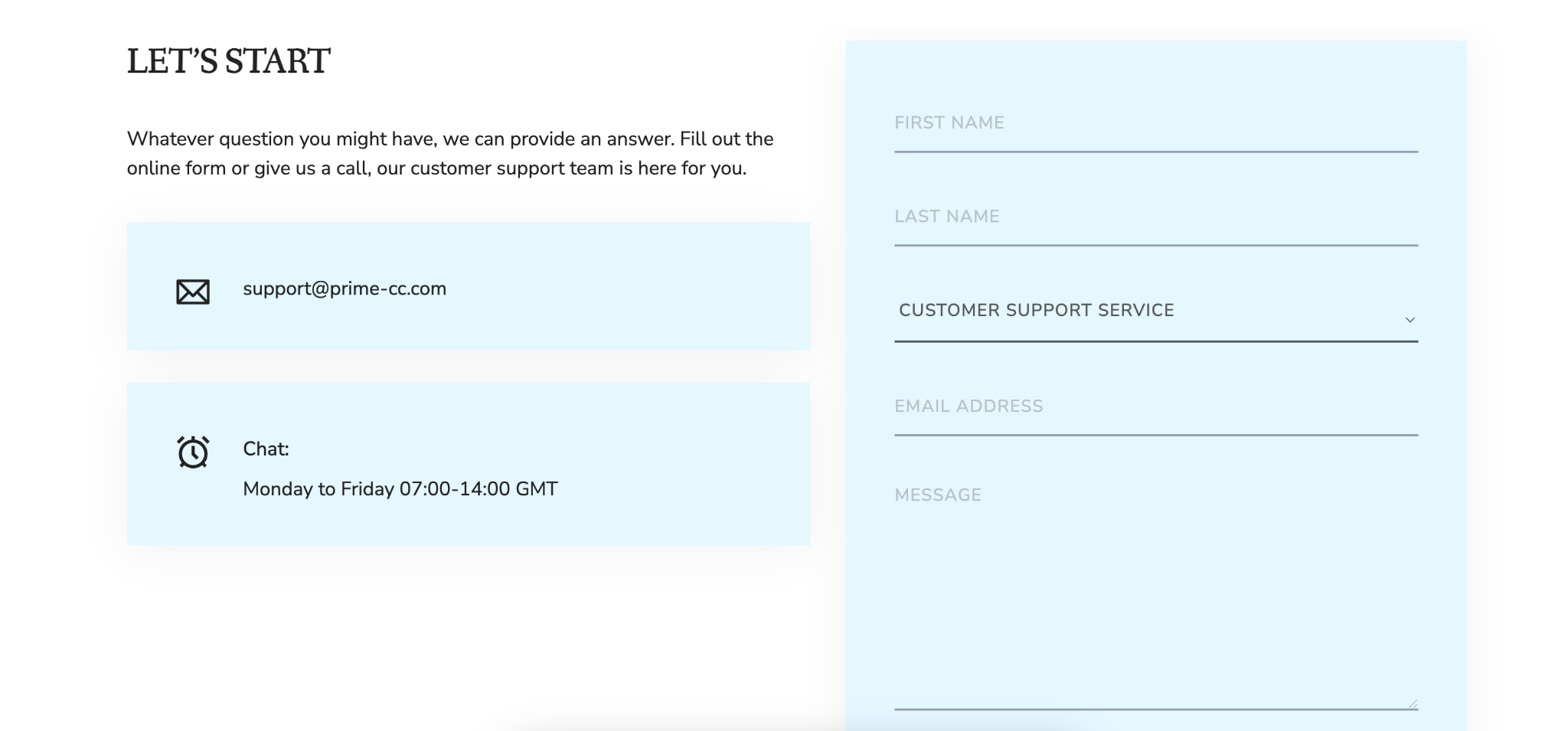 Prime-CC’s support team is reachable through various channels, catering to different preferences and needs. For traders who prefer written communication or need to send detailed inquiries, email support is available. This option allows users to describe their issues or questions at length and receive a comprehensive response. The response times for emails are typically prompt, ensuring that traders are not left waiting for the help they need.