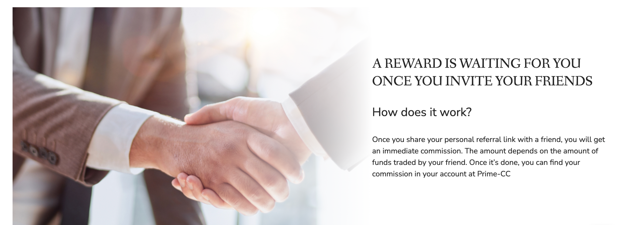 Prime-CC.com Review emphasizes the broker enhances its user experience by offering a referral program, which not only benefits the platform through increased user engagement but also rewards its existing clients. This program is designed to be straightforward and rewarding, encouraging users to share their positive trading experiences with friends and family.