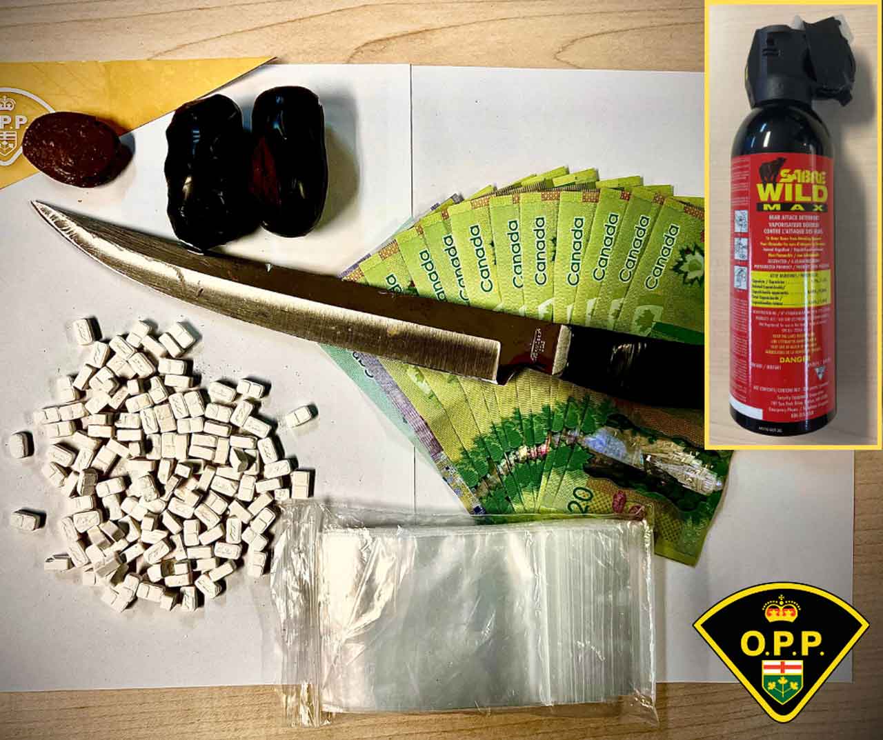 Upon investigation, the OPP discovered illicit substances within the vehicle, leading to the arrest of both occupants. The search yielded methamphetamine tablets, cannabis resin, also known as hash, along with bear spray, a large kitchen knife, and a sum of Canadian currency.