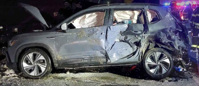 The collision happened when a vehicle attempting to pass a snow plow lost control, resulting in a crash involving two other vehicles. Five individuals sustained non-life-threatening injuries and were treated at a nearby hospital.