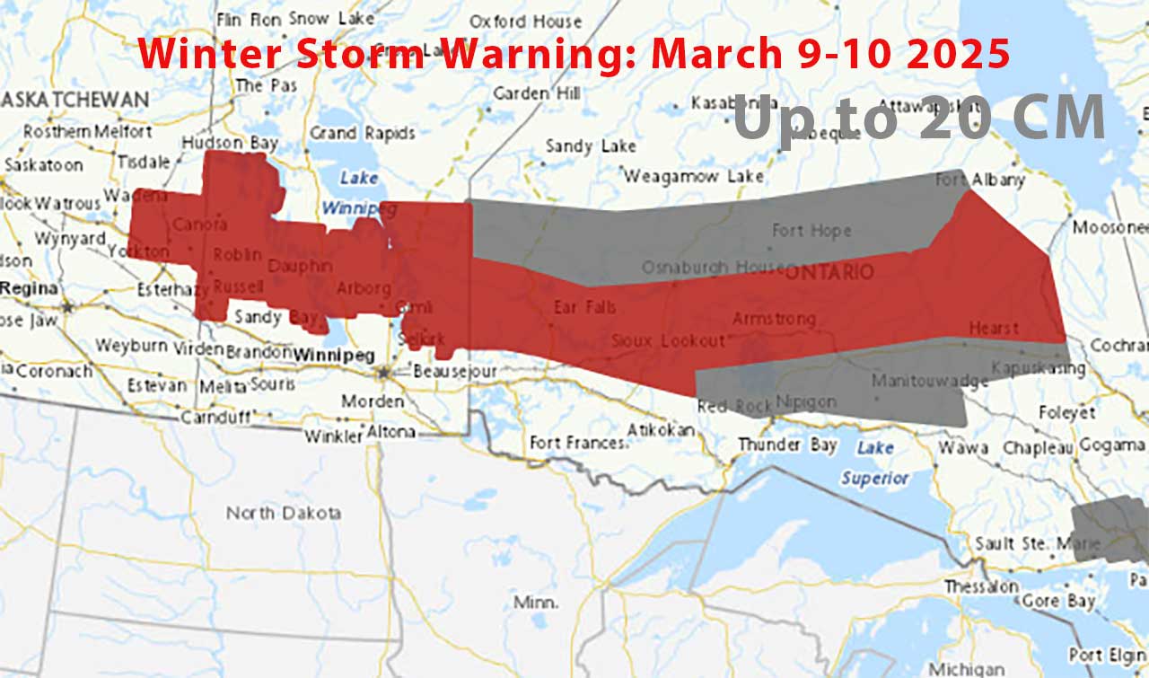 If you thought winter was winding down, Mother Nature has other plans! A Snowfall Warning has been issued for Sioux Lookout and Eastern Lac Seul, with 15 to 20 cm of fresh snow expected on Monday. Travelers along Highway 105, Red Lake, Ear Falls, Pickle Lake, and Armstrong should brace for challenging conditions as this system moves through.