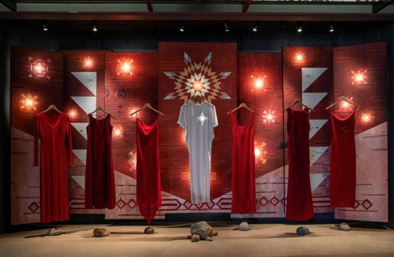 The reimagining of the exhibit featuring red dresses in the Canadian Journeys gallery is called Reclaiming Power and Place: Indigenous Women and Their Rights to Safety and Justice. The exhibit features the art installation “Only in Darkness Can We See the Stars,” that was co-created by Indigenous artists and matriarchs Jaime Black-Morsette and KC Adams.