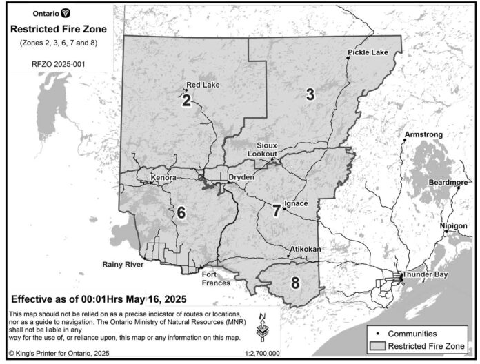 THUNDER BAY, ON – As wildfire conditions intensify across Northwestern Ontario, the Ministry of Natural Resources and Forestry (MNRF) has declared a Restricted Fire Zone (RFZ) for portions of the Northwest Fire Region, effective 12:01 a.m. Friday, May 16, 2025.