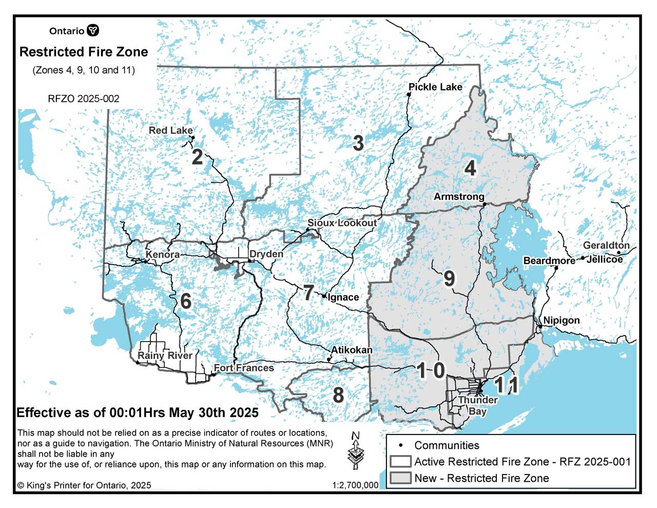 Thunder Bay – Wildfire Update – Due to the extreme forest fire hazard conditions and to reduce the number of human-caused fires, the Ministry of Natural Resources has declared a Restricted Fire Zone effective Friday, May 30, at 12:01 a.m. local time for a portion of the Northwest Region (Zones 4, 9, 10, 11).