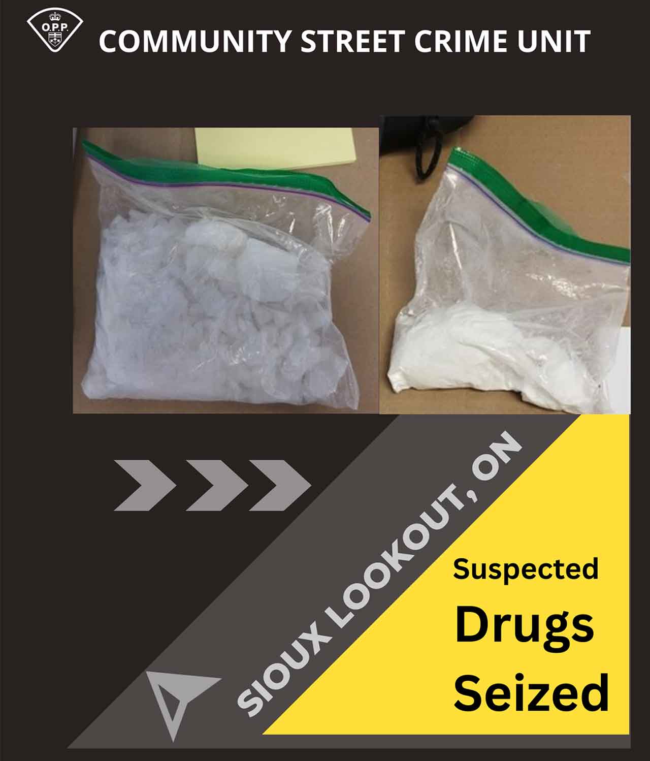 The OPP reminds residents that drug trafficking is a serious community safety concern. Anyone with information about the trafficking of illicit substances in Sioux Lookout is encouraged to call the OPP at 1-888-310-1122.