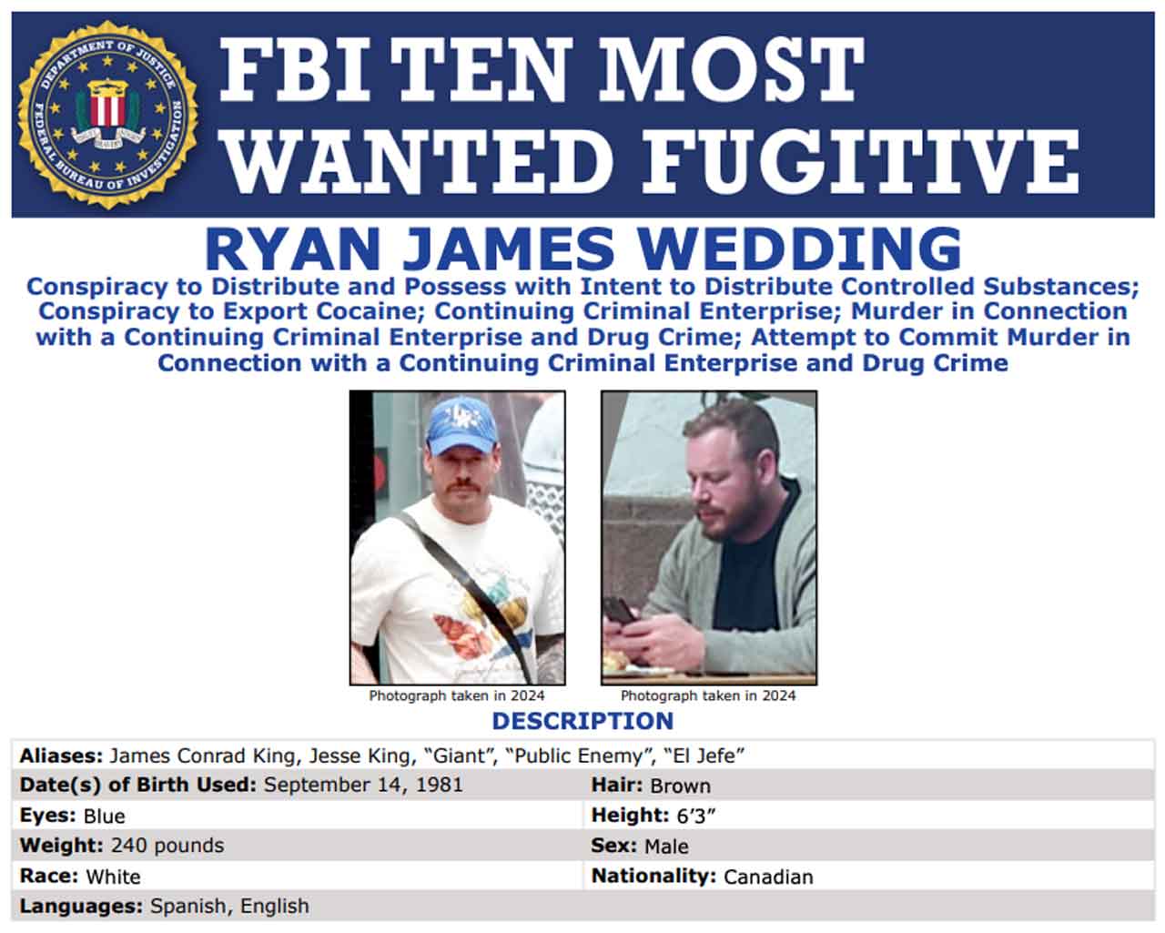 At the centre of the case is Ryan James Wedding, 44, a Canadian former Olympic snowboarder now on the FBI’s Ten Most Wanted Fugitives list. Investigators allege Wedding oversaw a criminal enterprise, laundered drug proceeds, and ordered hits, including the Medellín murder of a witness in a separate case. U.S. officials say the reward for information leading to Wedding’s arrest and/or conviction has been increased to up to US$15 million.