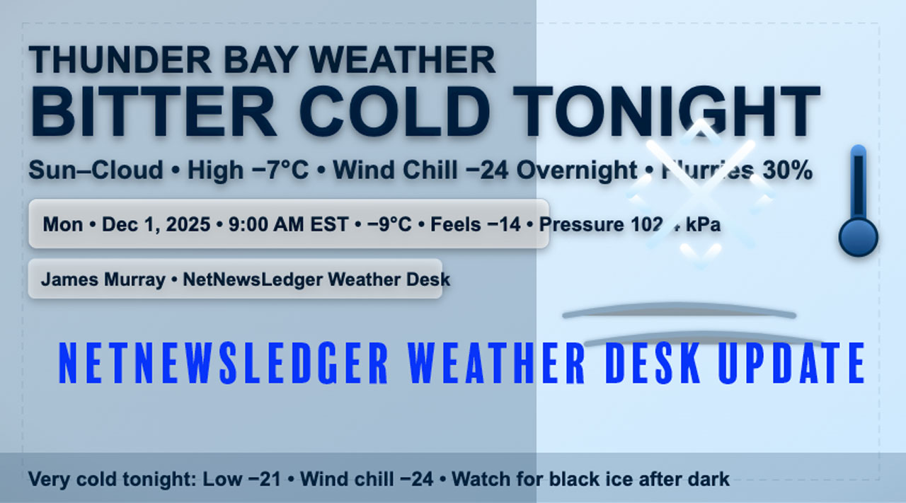 At 9:00 a.m. EST, Thunder Bay Airport reports light snow and –9.3°C (feels –14). Wind WSW 10 km/h, pressure 102.4 kPa and falling, humidity 67%, and visibility 24 km. It’s a gloves-on morning—yes, mittens on your kittens.