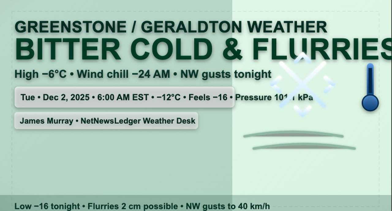 When a front comes through, southwest winds can cause narrow flurry bands to form over the Greenstone hills. One community gets dusted while the next stays grey but dry.