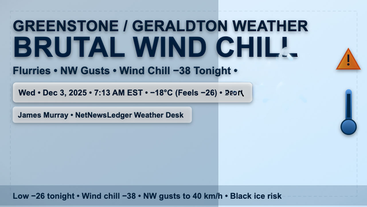 Greenstone–Geraldton: Bitter wind chills and spot flurries today. Low −26 tonight with wind chill near −38. Sun early Thursday, flurries return later. Frostbite risk.