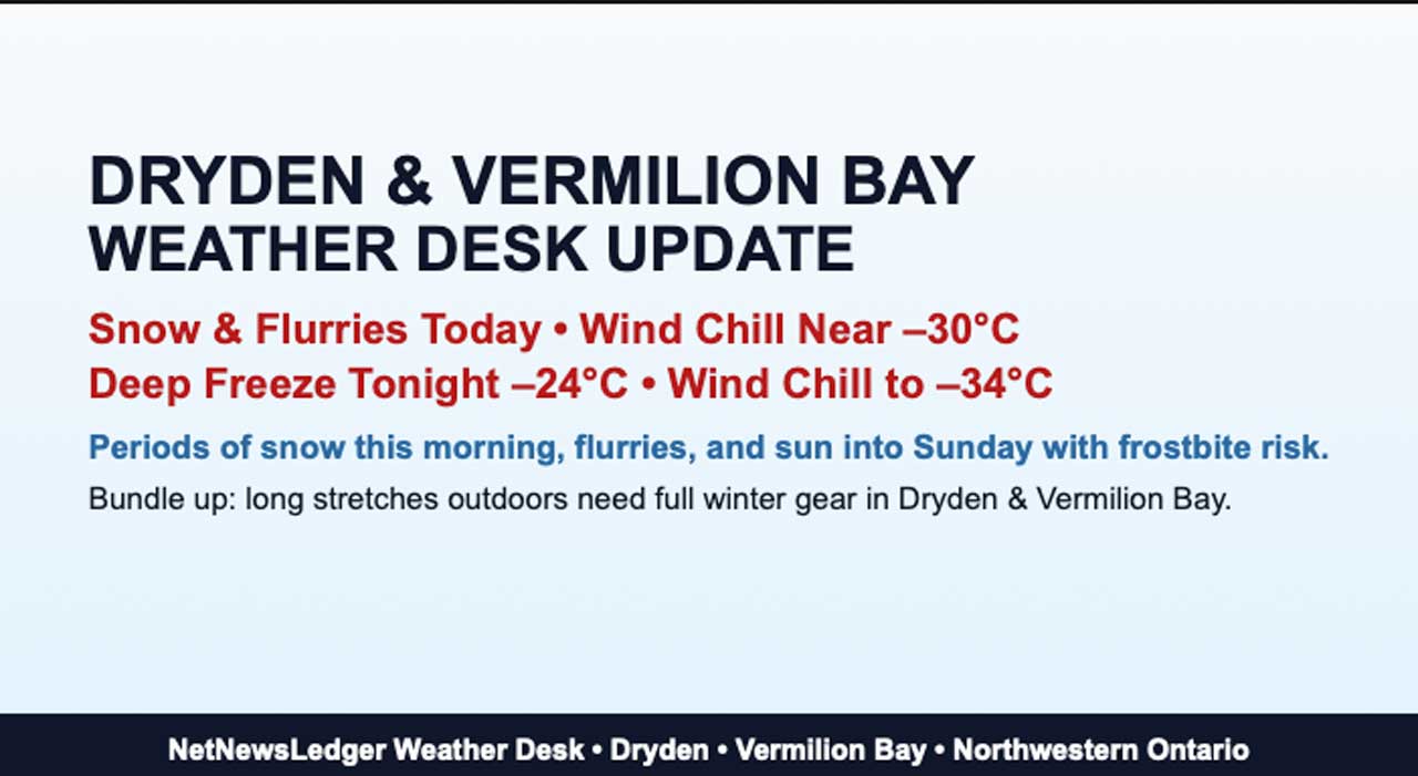 Dryden and Vermilion Bay see snow and flurries today with wind chills near –30, dropping to –34 tonight and staying brutally cold through the weekend with frostbite risk.