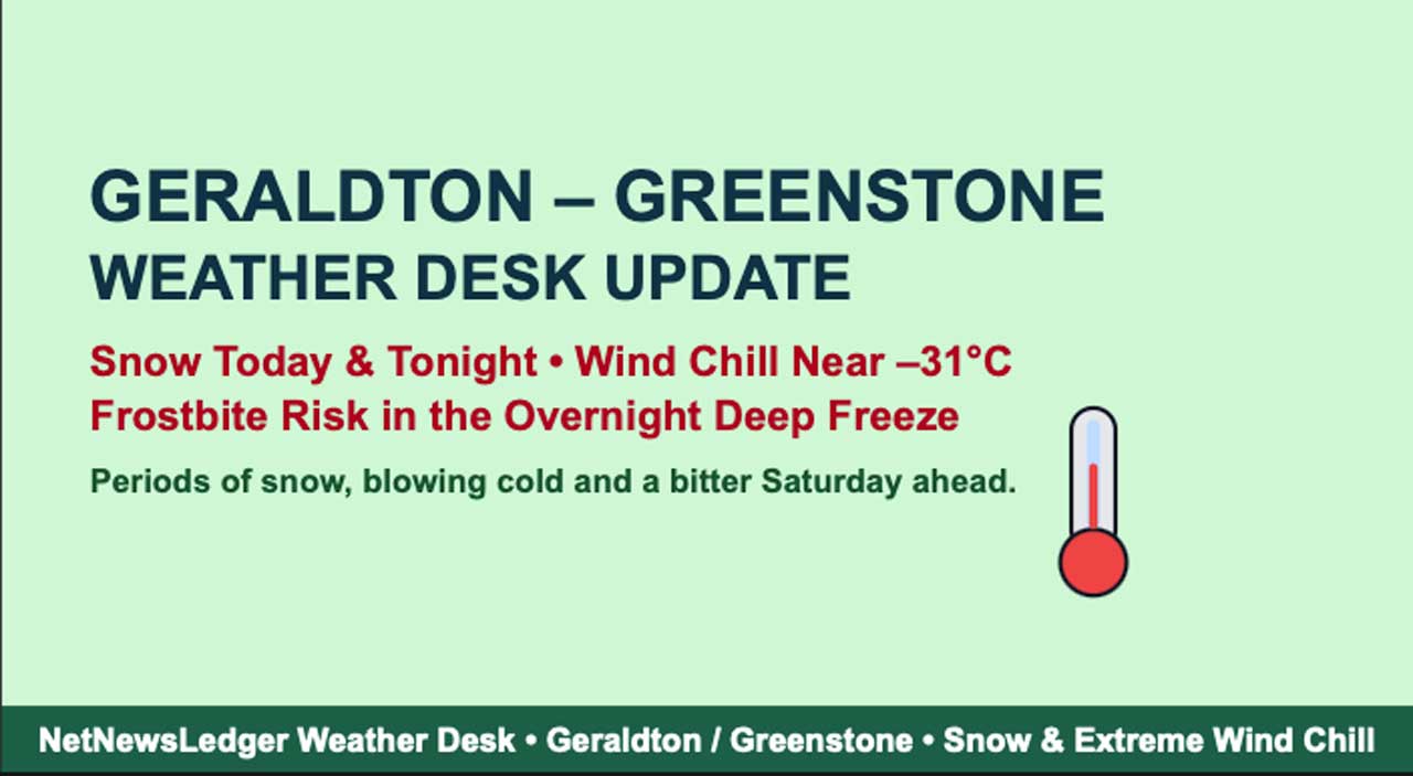 Thunder Bay – Weather Update – It’s a cold, grey start across the Geraldton and Greenstone region this Friday morning, with temperatures locked in the minus teens and a fresh round of snow and bitter wind chills lining up.