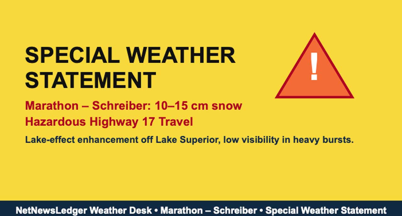 Marathon and Schreiber face 10 to 15 cm of snow today into tonight, with snow squalls, blowing snow, and hazardous travel along Highway 17.