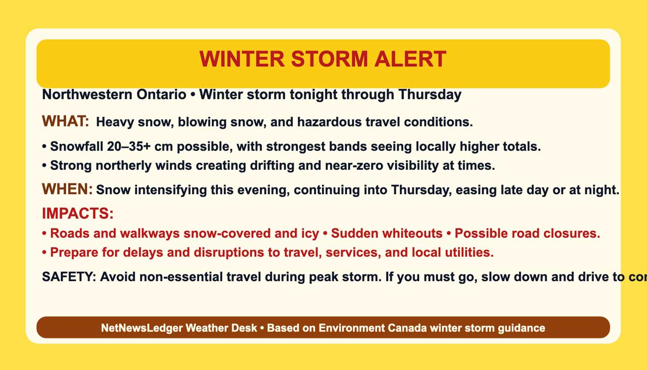 Sioux Lookout and Eastern Lac Seul face 20–35 cm of snow, strong NE winds, blowing snow and wind chills near –33°C from tonight through Thursday night.