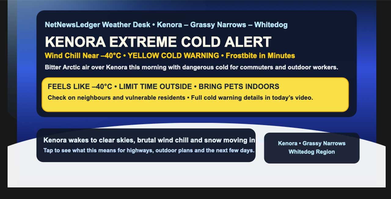 Kenora faces extreme cold with wind chills near -40, a Yellow Cold Warning, sunshine turning to snow, and dangerous frostbite risk this morning and tonight.