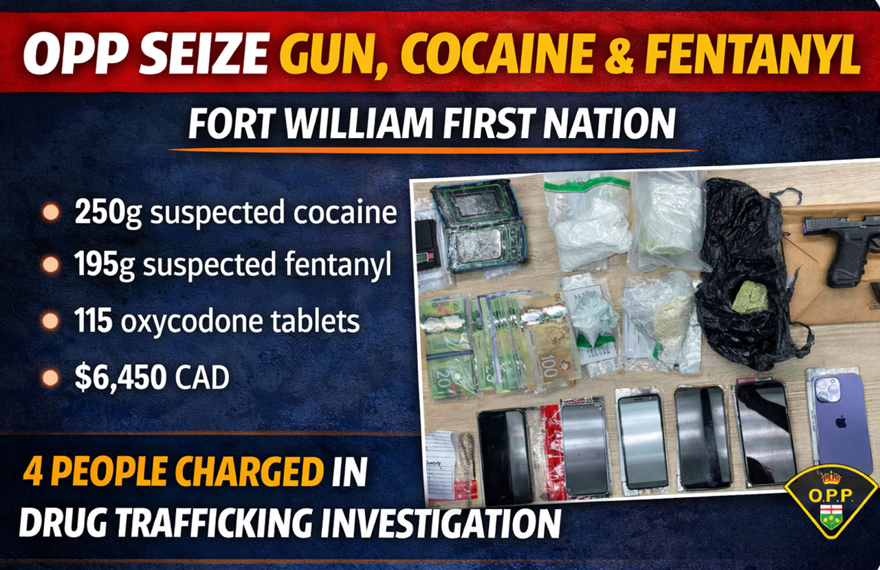 FORT WILLIAM FIRST NATION, ON – Four individuals are facing a combined 45 Criminal Code and Controlled Drugs and Substances Act (CDSA) charges following a major OPP-led guns and drug trafficking investigation on Fort William First Nation.