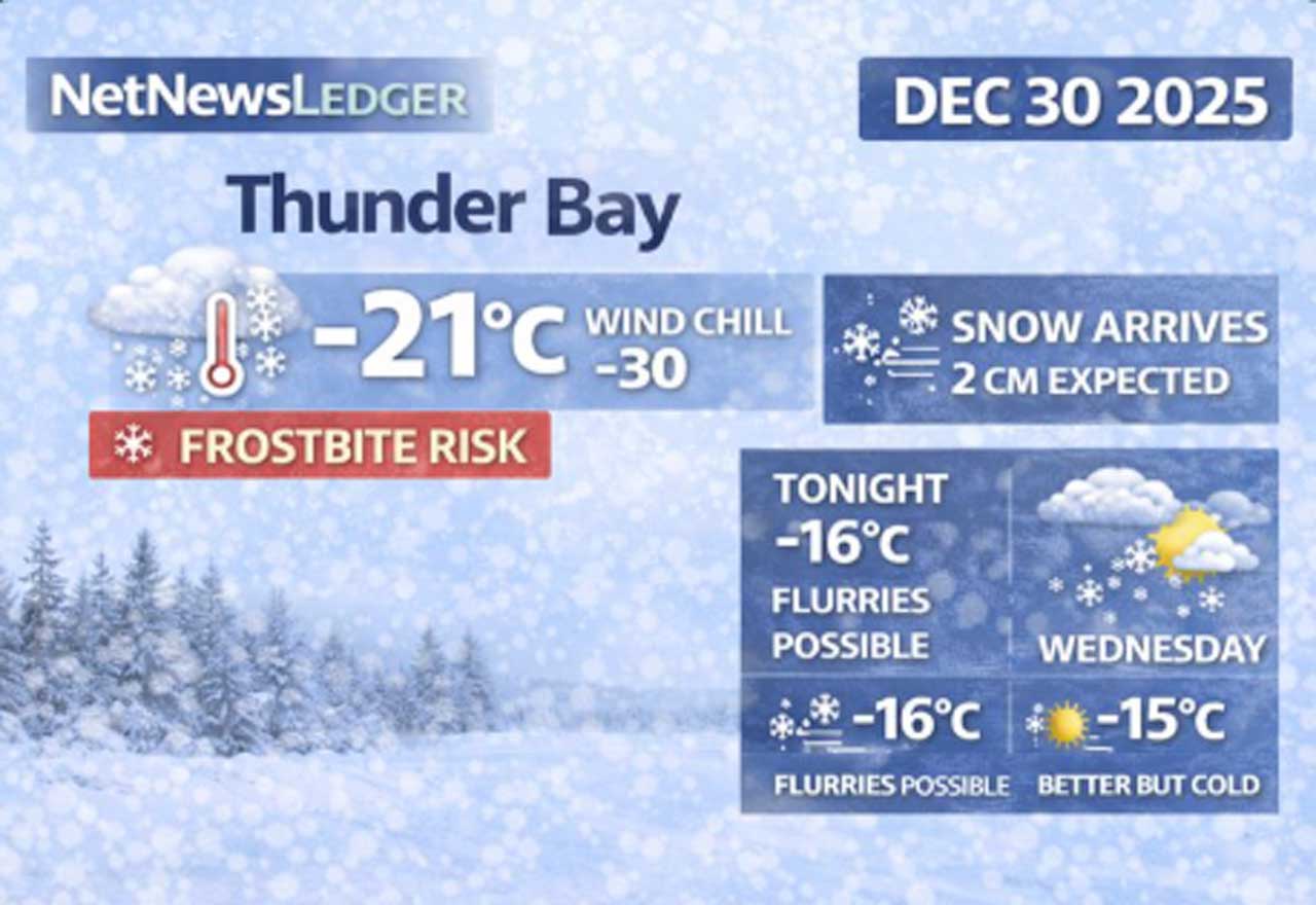 Thunder Bay weather forecast for Tuesday, Dec. 30, 2025: -21°C this morning with wind chill near -30 and frostbite risk. Clouds increase with periods of snow beginning this morning (~2 cm). Flurries possible tonight, then cold but brighter conditions Wednesday and a chance of snow New Year’s Day