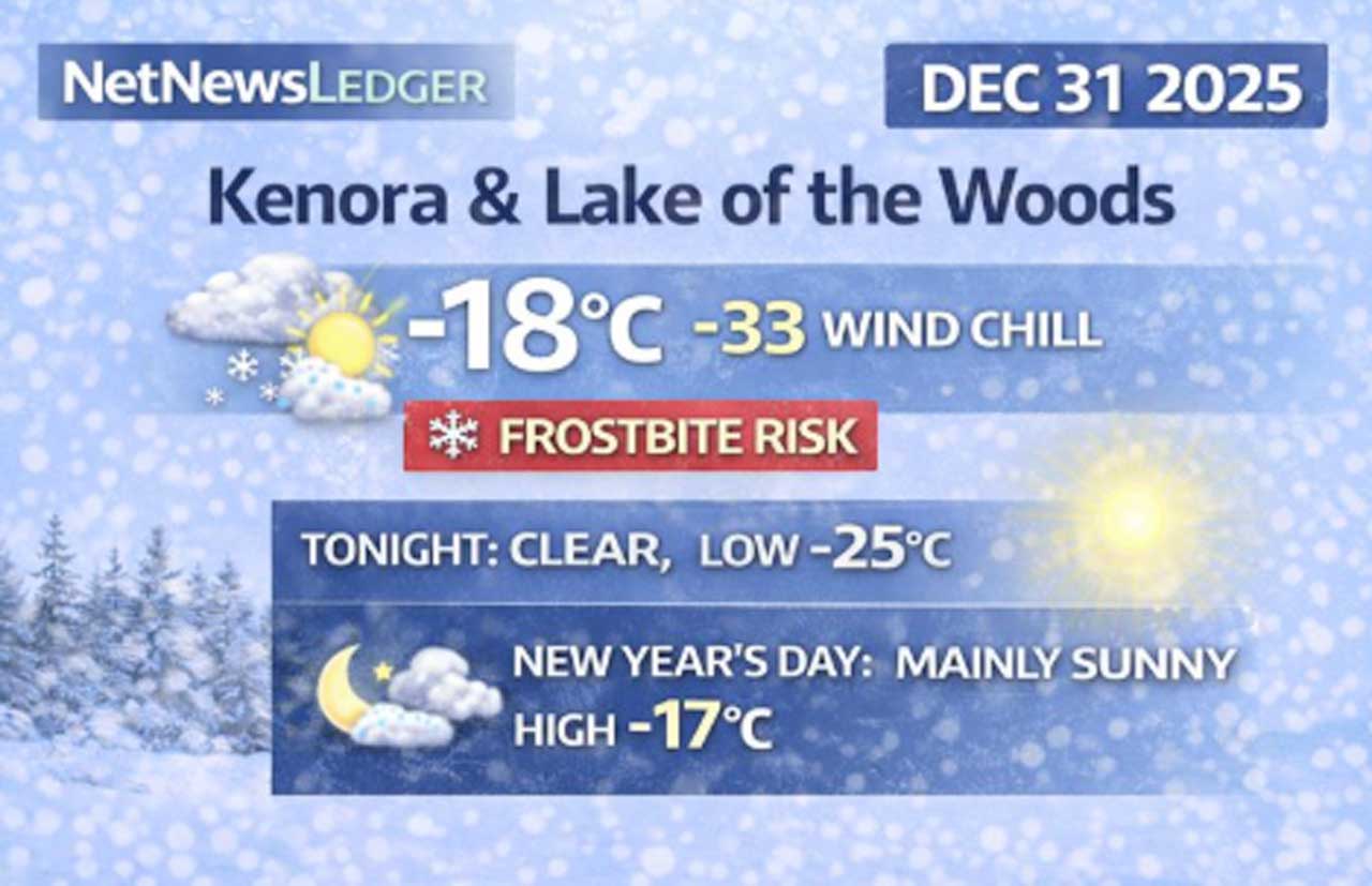 Thunder Bay – WEATHER – Kenora, Grassy Narrows, Whitedog First Nation, and the Lake of the Woods region are closing out 2025 in deep cold. Light snow is around early, but the bigger story is the wind chill—near -33 this morning and again overnight, with a risk of frostbite.