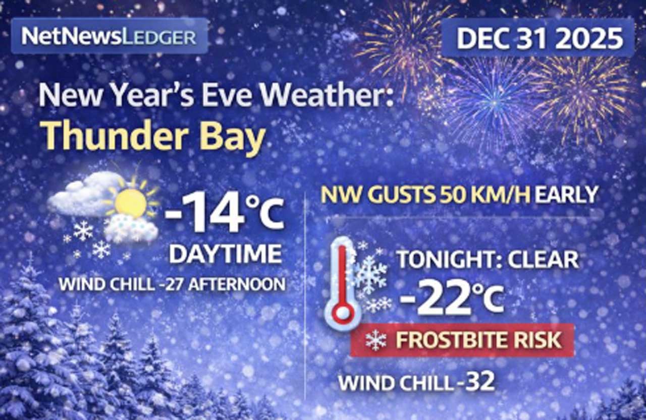 Thunder Bay weather forecast for Wednesday, Dec. 31, 2025: flurries this morning then sunny this afternoon with gusty NW winds. Clear tonight with lows near -22°C and wind chill near -32 with frostbite risk. Sunny but bitter New Year’s Day.