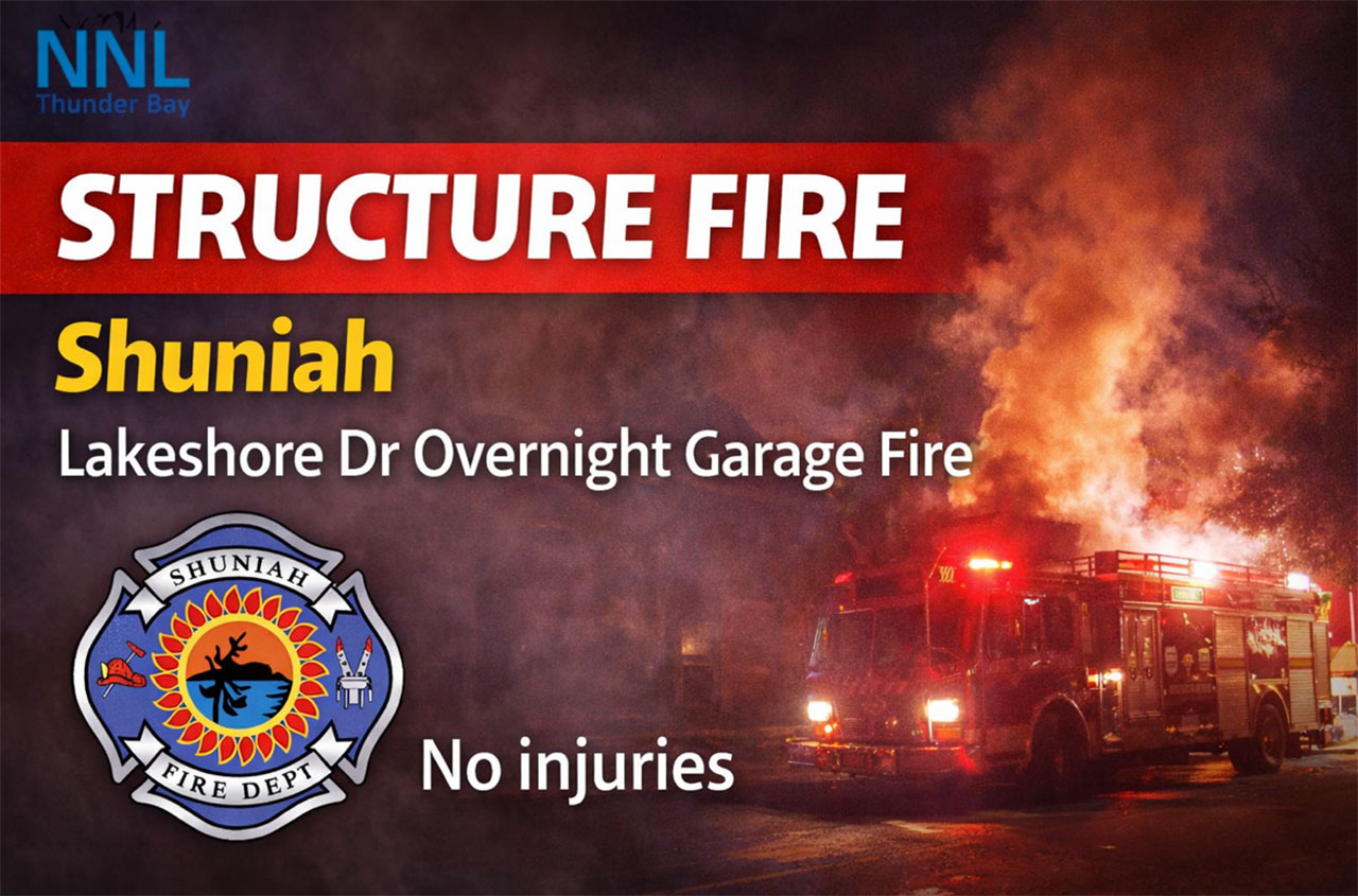 Overnight garage fire on Lakeshore Dr in Shuniah brought under control; no injuries reported.