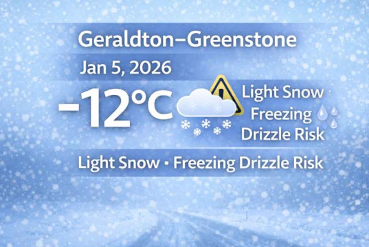 Geraldton–Greenstone weather for Monday, Jan. 5, 2026: periods of light snow with a risk of freezing drizzle this afternoon and overnight. Continued light snow chances Tuesday with freezing drizzle risk in the morning, followed by a milder midweek trend toward 0°C.