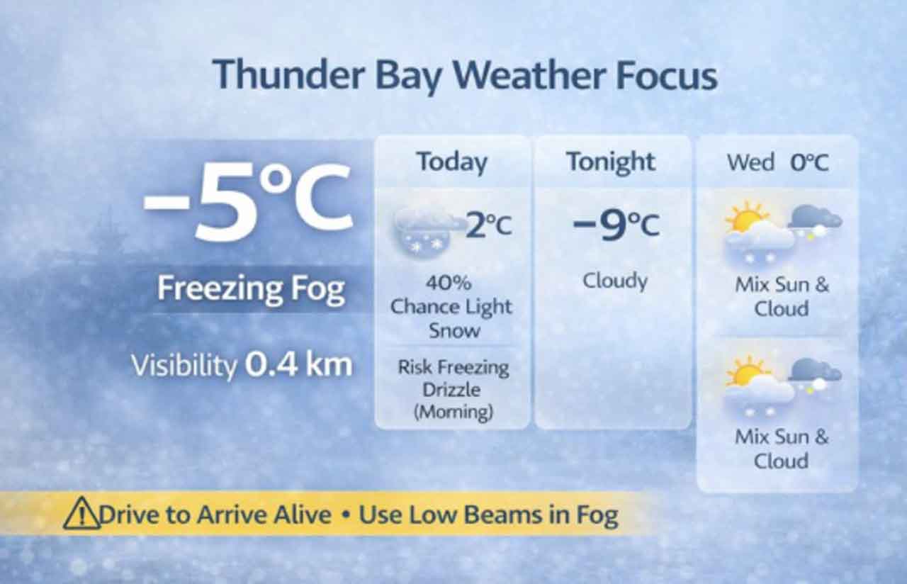 Thunder Bay – Weather Desk – Thunder Bay is waking up to freezing fog with very low visibility—the kind of morning where the biggest hazard isn’t heavy snow, but near-zero visibility and slick surfaces if freezing drizzle develops.