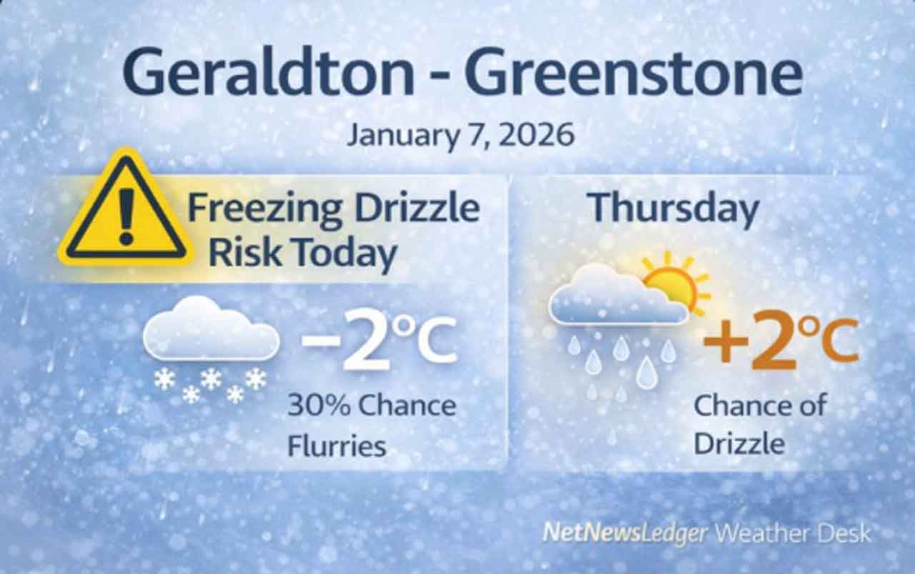 Geraldton–Greenstone weather for Jan. 7, 2026: cloudy with a 30% chance of flurries and a risk of freezing drizzle today and tonight. A brief warm-up arrives Thursday with a 40% chance of drizzle and a high near +2°C, then cooler Friday with flurries possible.