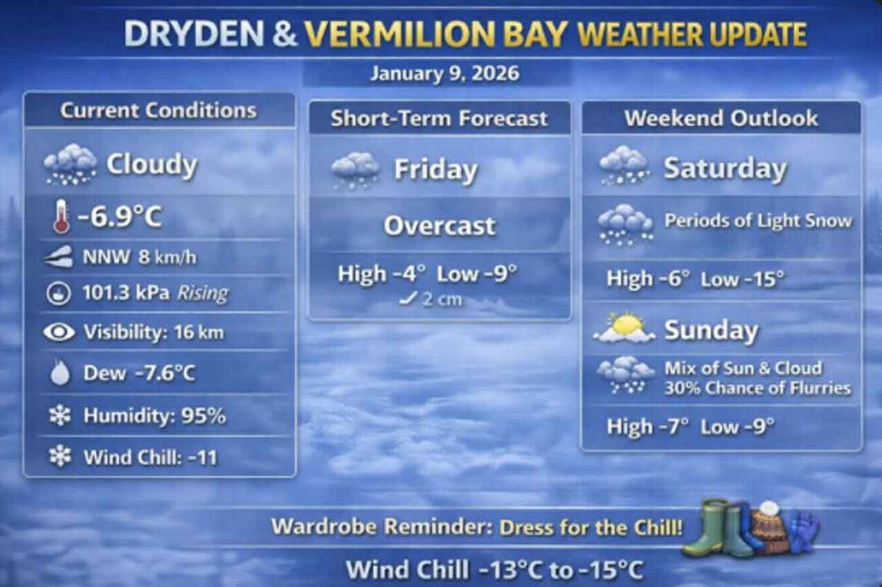 Dryden and Vermilion Bay weather update for January 9, 2026: Overcast today with snow beginning tonight. Weekend outlook includes light snow Saturday and wind chills near -15°C. Full forecast and winter wardrobe tips included.