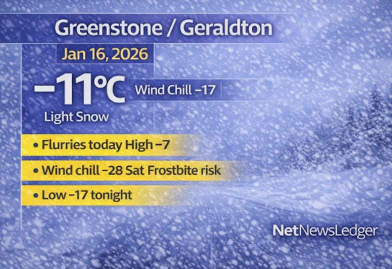 Greenstone–Geraldton weather forecast for January 16, 2026: Light snow early with flurries today and highs near -7°C. Colder air builds tonight and Saturday with wind chills near -28 and frostbite risk. Bitter cold continues into Sunday with more snow late.