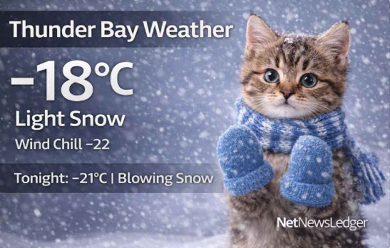 Thunder Bay – WEATHER Desk – Thunder Bay remains in a mid-winter cold pattern today, with light snow in the morning and more periods of light snowdeveloping later this afternoon. The bigger impact arrives tonight as winds strengthen out of the northwest, creating local blowing snow, lowering visibility at times, and driving wind chills toward -32.