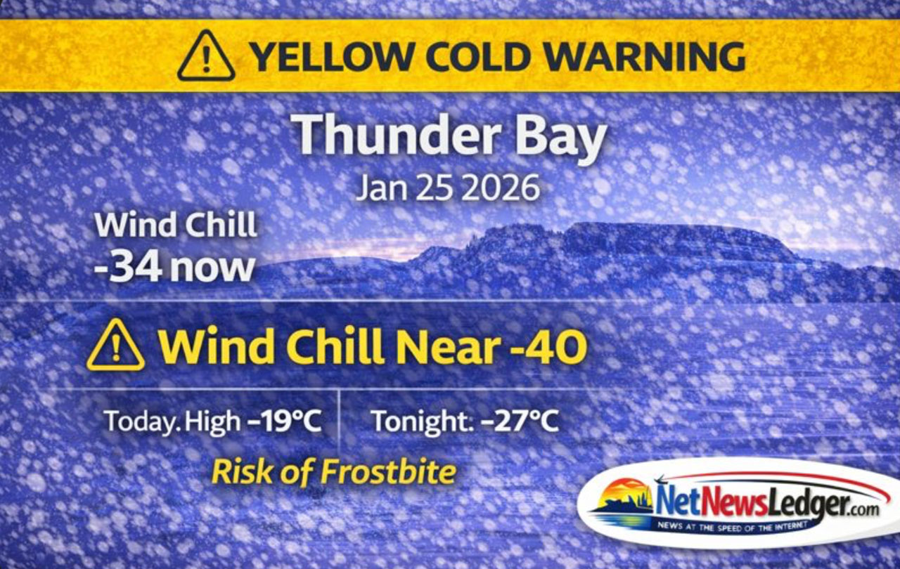 Thunder Bay remains under a Yellow Cold Warning on Jan. 25, 2026, with wind chills near -40 possible this morning and potentially returning tonight into Monday morning. Sunny today, then clouds and flurries Monday with snow chances Monday night