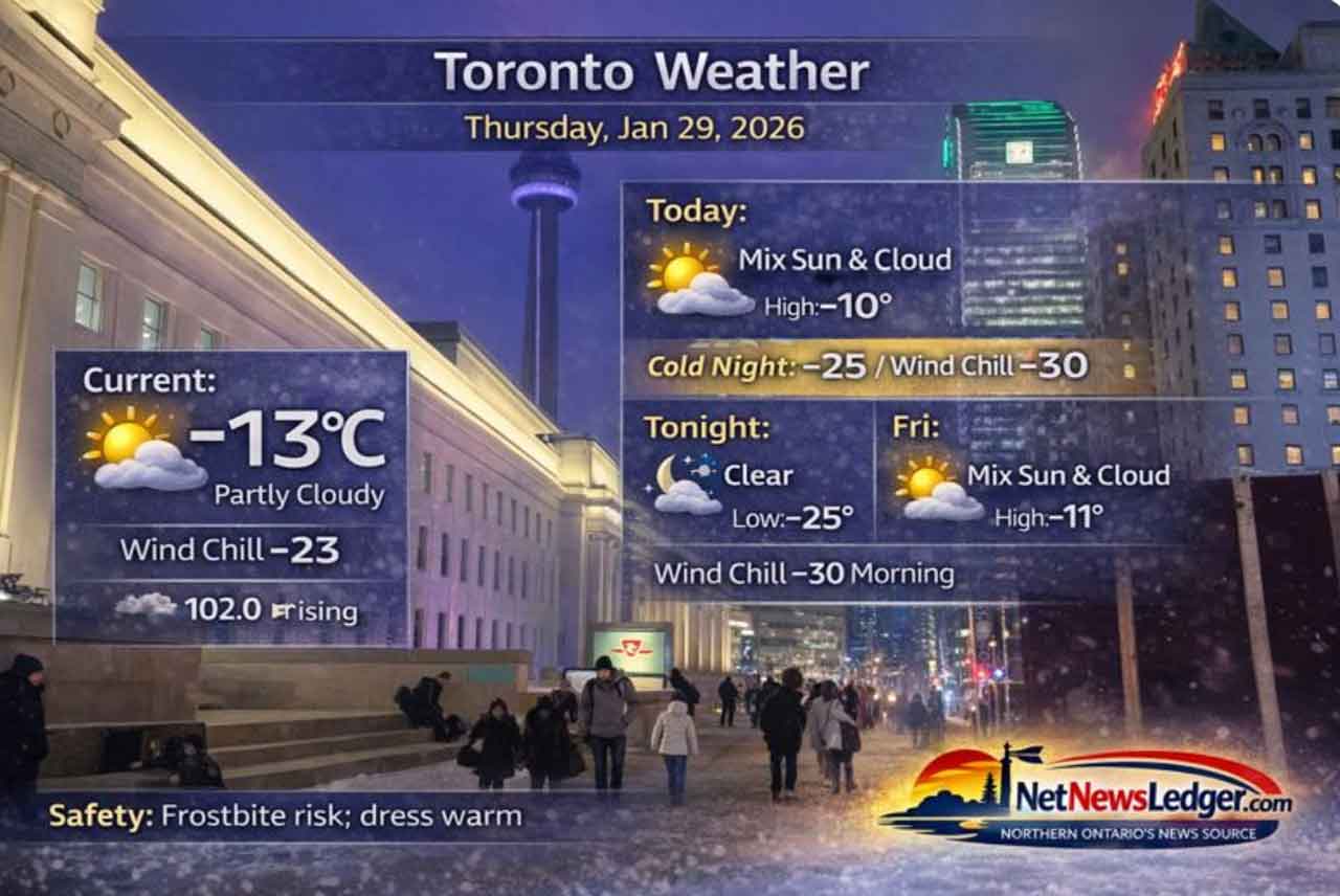 Toronto weather update for Thursday, January 29, 2026: mix of sun and cloud with a high of -10°C and wind chill near -23 this morning. Clear tonight with a plunge to -25°C and wind chill near -30. Cold continues Friday, with gradual moderation by Sunday.