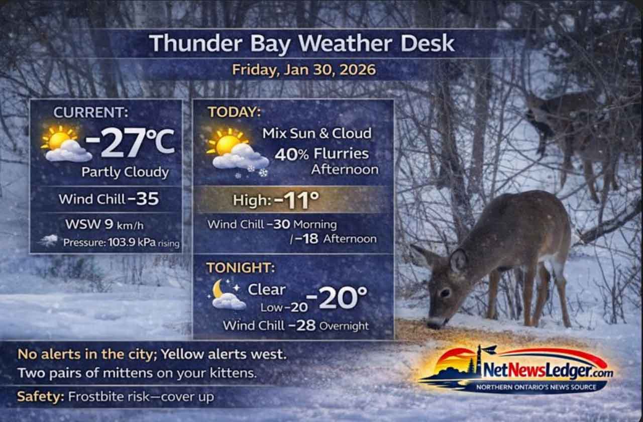 Thunder Bay weather forecast for Friday, January 30, 2026: partly cloudy and bitterly cold near -27°C with wind chill -35. Mix of sun and cloud with a 40% chance of flurries this afternoon, then clear tonight. Milder daytime trend this weekend with snow chances Sunday.