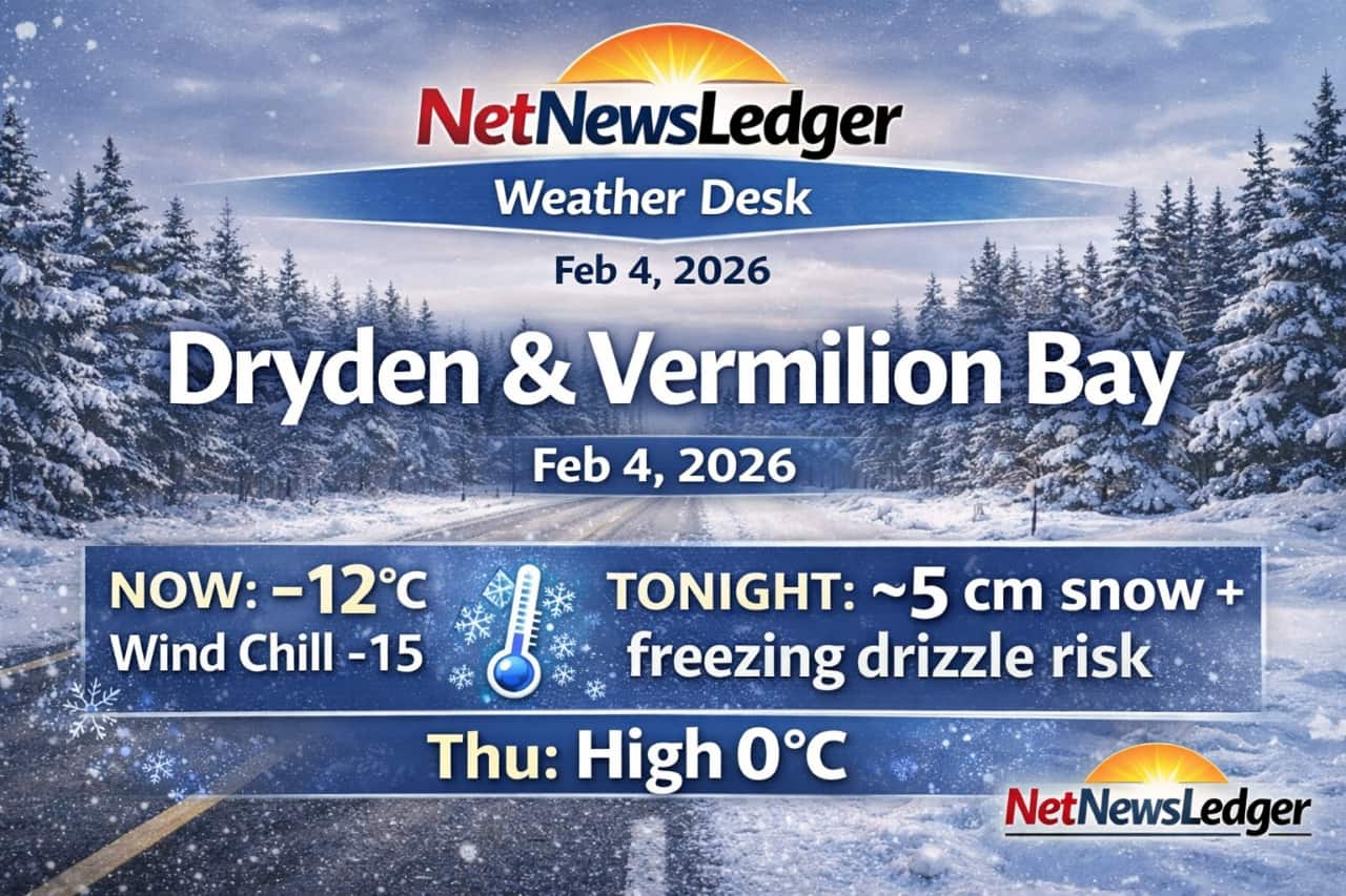 Dryden & Vermilion Bay forecast for Wednesday, Feb. 4, 2026: cloudy and -12°C early with light NW winds. 40% chance of morning flurries today, then 5 cm of snow tonight with a risk of freezing drizzle. Thursday warms to near 0°C; sunny Friday turns colder again.