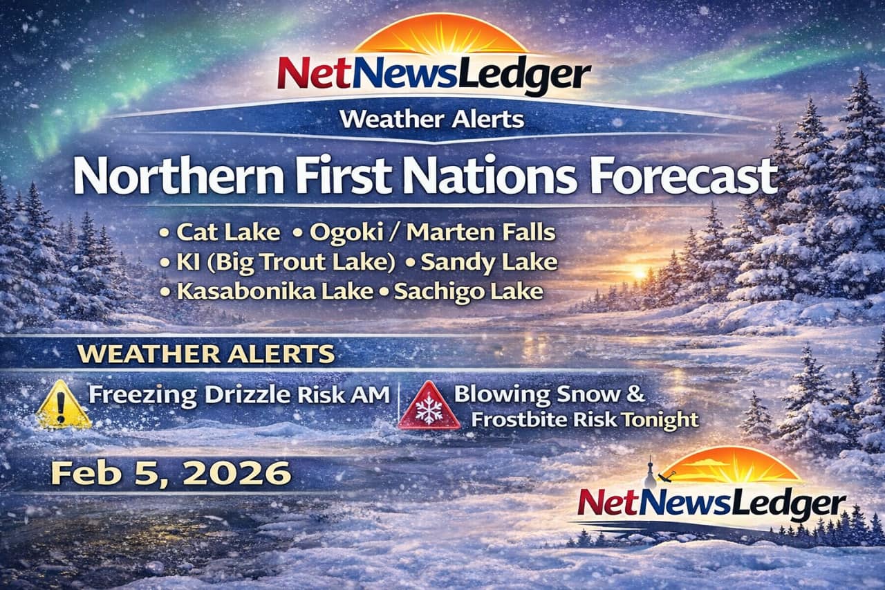 Northern Ontario First Nations forecast for Cat Lake, Sandy Lake, Ogoki/Marten Falls, KI (Big Trout Lake), Kasabonika & Sachigo Lake—freezing drizzle advisory, snow, and dangerous wind chills.