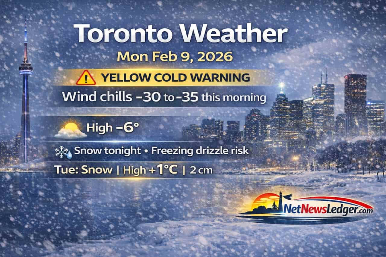 Toronto weather forecast for Monday, February 9, 2026: Yellow Cold Warning with wind chills as low as -30 to -35 this morning. Mainly sunny today with a high of -6°C. Light snow develops tonight with a freezing drizzle risk, then periods of snow Tuesday with a high of +1°C