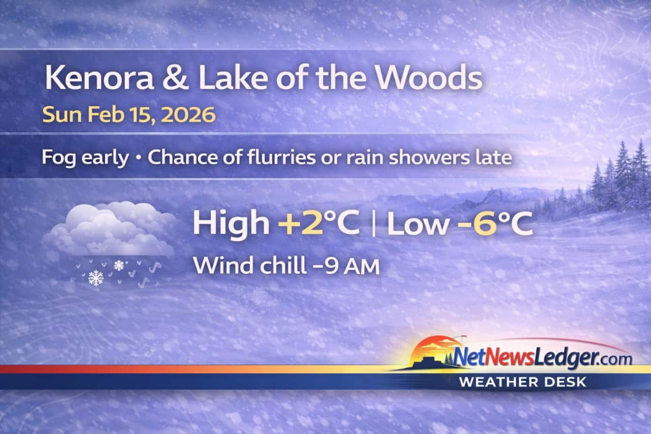 Kenora and Lake of the Woods weather for Sunday, February 15, 2026: fog patches dissipate this morning, then cloudy with a 40% chance of flurries or rain showers late today. High +2°C. Fog returns overnight with a low of -6°C. Clearing Monday (high -1°C), then milder Tuesday (high +2°C).