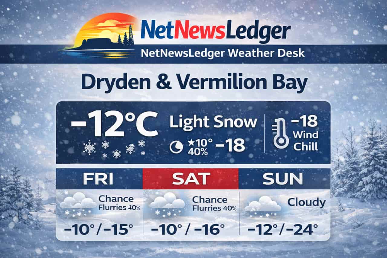 DRYDEN – WEATHER – Dryden and Vermilion Bay are starting Friday with light snow and a sharp wind chill, setting up a weekend that stays mostly cloudy with occasional flurries. The bigger headline is the cold: overnight lows drop into the mid-to-upper teens below zero, with a deep freeze near -24°C by Sunday night.