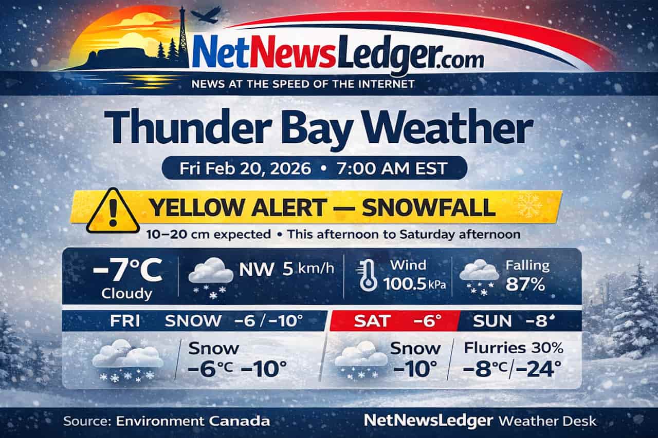 Environment Canada has issued a Yellow Warning – Snowfall for the City of Thunder Bay, with significant snow (10 to 20 cm) expected from this afternoon into Saturday afternoon, bringing moderate impacts and difficult travel conditions for the region.