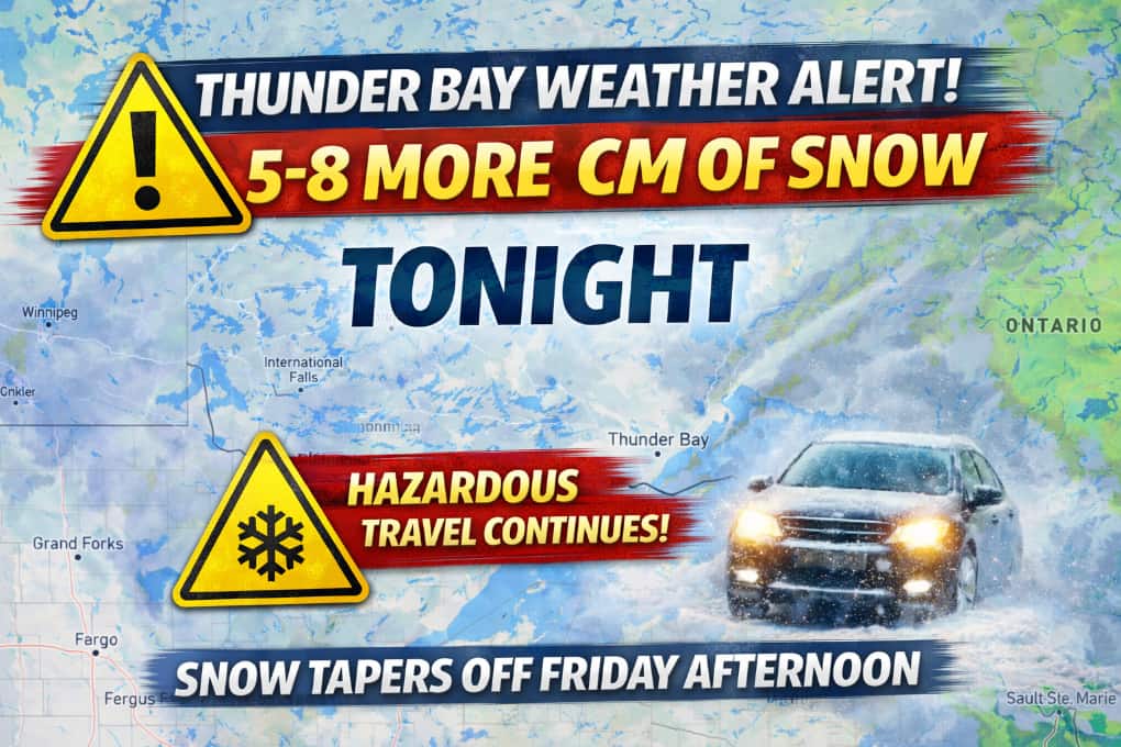 Thunder Bay – WEATHER – Thunder Bay is heading into another difficult stretch of winter weather, and both forecasters and police are urging people to take it seriously. Environment Canada has a Yellow Snowfall Warning in effect for the city, with 10 to 20 centimetres of snow expected from Thursday afternoon into Friday morning. At the same time, the Thunder Bay Police Service says snow, ice, and reduced visibility are already creating hazardous driving conditions across local roads.