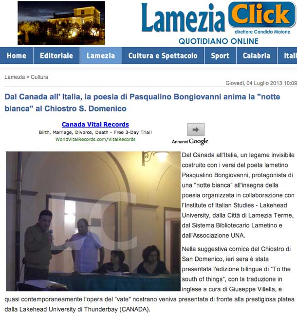 THUNDER BAY – The Institute of Italian Studies at Lakehead University is hosting a book launch on July 3rd 2013. The event generated a great deal of excitement as well in Lamezia in Italy, were at 02:00(GMT+1) where a fairly large number of people gathered in the community to watch the live stream.